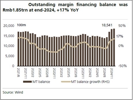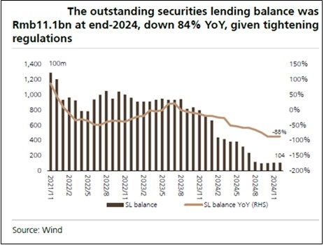 Margin financing/securities lending (MF/SL) to grow balance sheet: The retail sentiment has improved significantly since Q424, leading to the margin financing balance at year-end to be 17% higher yoy. In 2024, regulators kept a tight stance on securities lending. The SL balance at year-end was merely ~RMB 10 bn, 84% down from end-2023. However, with improvement in sentiment and market rebound, this part of the business for brokers is likely to scale up sharply in 2025 and beyond. This segment is directly corelated to the growth in the equity market participation and ties in with brokerage income from transactions and interest income for the securities industry.