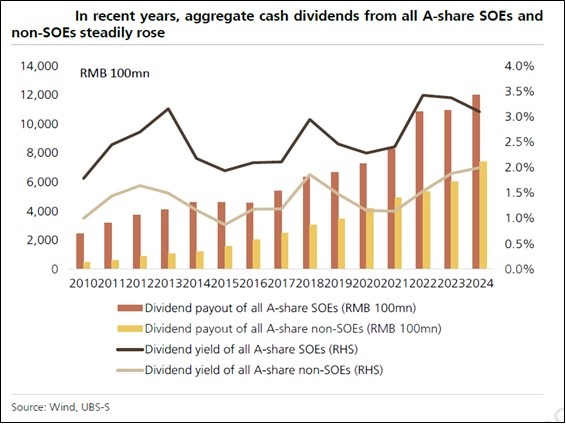 Growing cash returns from companies: In the backdrop of the still existing skepticism of the Chinese markets lies a story of rising dividends and share buybacks across SOE and non-SOE companies alike. According to an announcement by the PBOC and the CSRC in January 2025, over 300 listed companies disclosed that they used bank loans to conduct share buybacks. Further, the aggregate cash dividends of A-share list cos rose from less than RMB 300 bn in 2010 to RMB 1.93 trn in 2024, achieving a 14.4% CAGR.