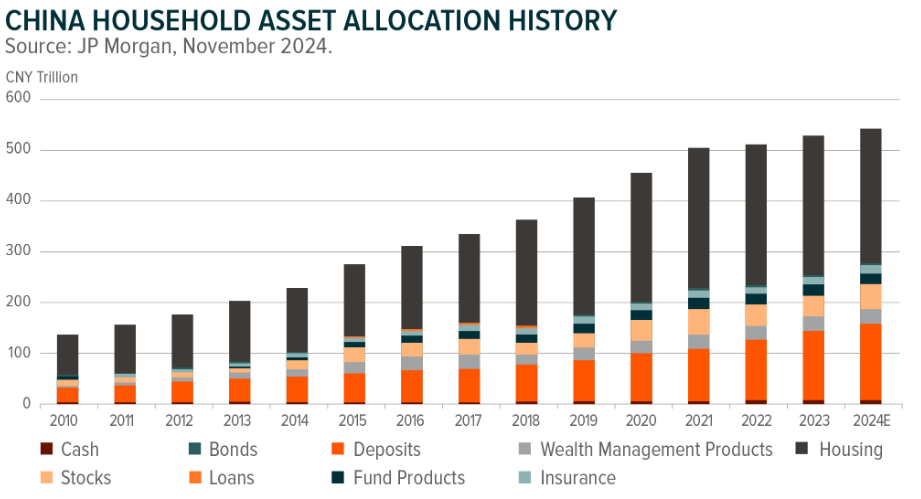 This mountain of cash, i.e. total household deposits, had reached a whopping RMB 150 trn at the end of September 2024 and is growing further. This is larger than China’s GDP (RMB 134.9 trn in 2024) and China’s A-Share total market cap of ~RMB 90 trn.