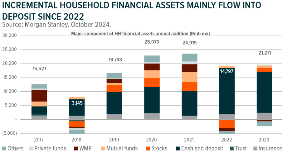 Chinese cash sitting on the sidelines: China has the second largest pool of wealth in the world, which is invested across multiple asset classes. In 2023, China and the US contributed 17% and 25% respectively to the world’s total wealth. However, the Chinese wealth management industry encountered major setbacks due to stock market volatility and a decline in real estate values together with regulatory changes, which has led to cash hoarding in bank accounts. As a result, a mountain of cash has piled up on the sidelines, as can be seen from the accompanying chart.