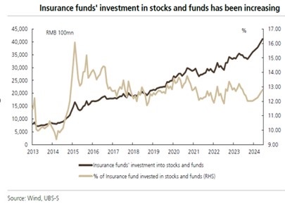 - A new regulatory mandate requires state-owned insurers to invest 30% of newly-received premiums into yuan-denominated equities from 2025 onwards. Based on 2024 premiums (~RMB 1.35 trn), projections estimate RMB 404.1 bn will flow into domestic equities in 2025 from five major insurers. Government statements targeted at least RMB 100 bn to be invested by insurers in the first half of 2025.